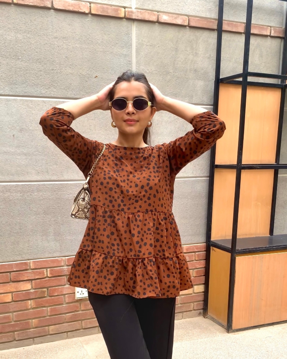 This summer-friendly Georgette top is a mix of brown and black. It features a comfy round neck, elastic sleeves, and a cute frock-style design.