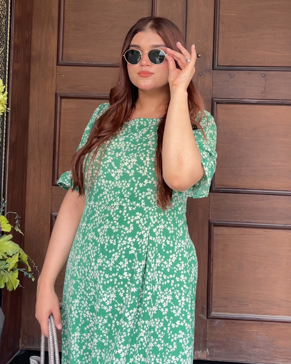 This summer-friendly Georgette Green and White Floral Dress come with elastic shoulders, pleats at the waist, and cute ruffled sleeves.
