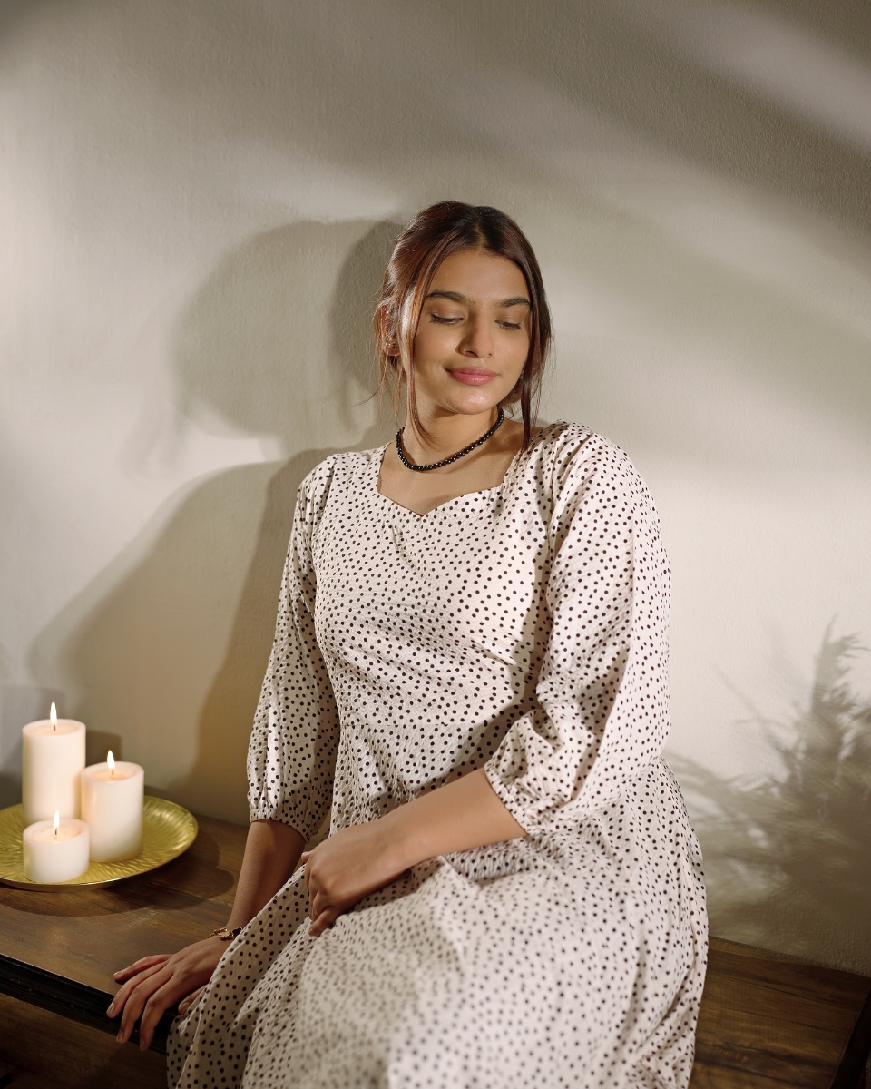 Get ready for comfort and style with this flared polka dot dress. It features a pretty princess neckline and elastic sleeves, all made from soft, breathable cotton for a relaxed fit.
